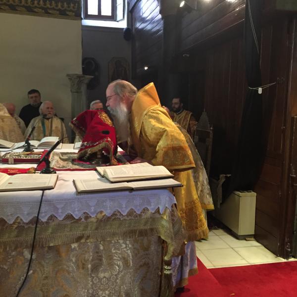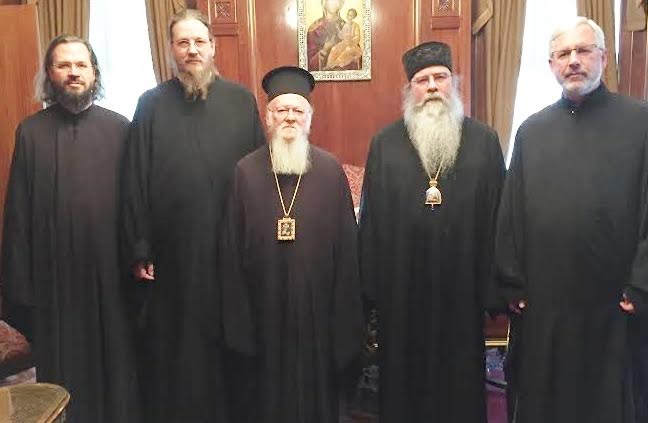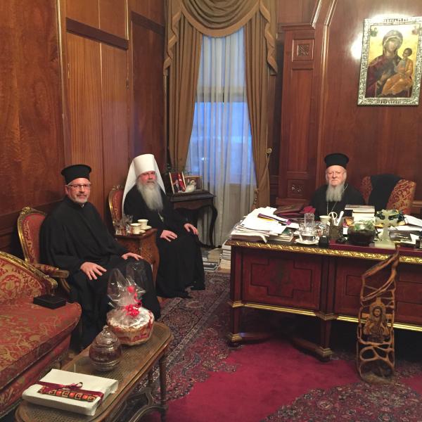 CONSTANTINOPLA (ISTAMBUL) – TURQUIA, março 2016 — O Metropolita Tikhon da Igreja Ortodoxa da América (OCA) atendeu a um convite de S.S. o Patriarca Ecumênico Bartolomeu de Constantinopla para concelebrar a Divina Liturgia na Igreja Patriarcal de São Jorge, no «Domingo da Ortodoxia» celebrado em 20 de março de 2016. Acompanhado do padre João Jillions, o Arcebispo Tikhon chegou a Istambul no sábado, 19 de março, pouco depois de um atentado terrorista ter matado e ferido mais de 30 pessoas na zona turística da cidade. Na noite de sábado, participaram das Vésperas presididas pelo Patriarca Bartolomeu na Igreja Patriarcal de São Jorge, do Fanar. Em seguida, o Metropolita Tikhon e Pe. John foram convidados a um encontro com o Patriarca Bartolomeu em seu escritório. Após saudar o Patriarca Ecumênico em nome dos Bispos do Santo Sínodo da Igreja Ortodoxa na América, o Metropolita conversou com S. Santidade sobre temas relacionados ao próximo Grande e Santo Concílio, bem como, sobre as perspectivas de diálogo com o Patriarcado no que diz respeito à unidade ortodoxa e a regularização da situação canônica da igreja na América do Norte, entre outros. Por sua vez, o Patriarca Bartolomeu dirigiu a palavra saudando os visitantes e, ao final, após a troca de presentes, encorajou o Metropolita Tikhon a visitar novamente o Patriarcado no futuro. Após o encontro, o Metropolita e Pe. João jantaram na companhia do Patriarca Bartolomeu e de alguns dos membros do Santo Sínodo do Patriarcado Ecumênico, incluindo Sua Eminência, o Metropolita João de Pérgamo [Zizioulas]. No domingo, 20 de março, Domingo da Ortodoxia, S. S. Bartolomeu I presidiu a Divina Liturgia festiva na qual concelebraram o Metropolita Tikhon e hierarcas membros do Santo Sínodo do Patriarcado Ecumênico. Após a Liturgia na Igreja Patriarcal, teve lugar um serviço memorial por aqueles que sofreram e morreram por causa da fé, e a tradicional procissão com os ícones.