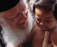 Nosso Patriarca Ecumênico, S. Santidade Bartolomeu I, quando visitava o Brasil pela primeira vez, para o Simpósio «Amazônia, Fonte de Vida» realizado na Amazônia entre 13 e 20 de julho de 2006, toma carinhosamente em seus braços um pequeno brasileiro nativo. Na foto ampliada (clique sobre o detalhe para ver), nosso arcebispo Metropolita Dom Tarasios, seu Exarca para a América do Sul, que acompanhou S. Santidade durante todo o evento.