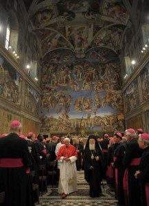 — Antes de tudo, sinto-me orgulhoso ao ver Sua Santidade, o Patriarca Ecumênico Bartolomeu, na Capela Sistina, onde os papas são eleitos, famosa também por seu valor artístico mundial, pois considero uma grande honra o convite do Papa Bento ao primus inter pares da Igreja Ortodoxa. O evento foi acolhido pelos padres sinodais; todos estavam presentes, como um verdadeiro momento de «graça», e assim o recolheu no título da primeira página o L’Osservatore Romano. Em sua homilia, o Patriarca fez referência à interpretação da Palavra de Deus-Verbo Divino, segundo o ensinamento e os escritos dos Padres da Igreja. Foi uma homilia magistral, pois apresentava a posição da Igreja Ortodoxa sobre o tema, inspirada na riqueza da espiritualidade oriental e ortodoxa. É histórico que um Papa celebre as vésperas diante dos representantes de todo o episcopado católico e que nessa ocasião não exerça seu ministério de mestre, mas que o conceda ao segundo bispo da Igreja quando esta ainda não estava dividida. O que mais me impressionou foram as palavras do Pontífice ao concluir a homilia do Patriarca, acolhida por um longo aplauso: «se temos pais comuns, como não podemos ser irmãos?»