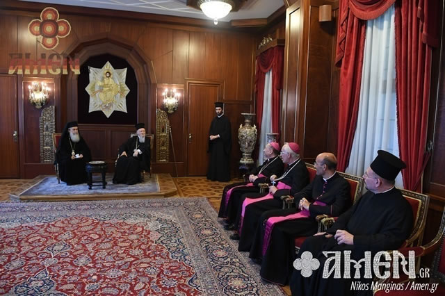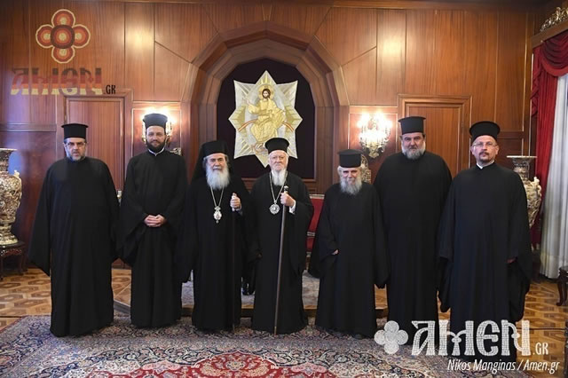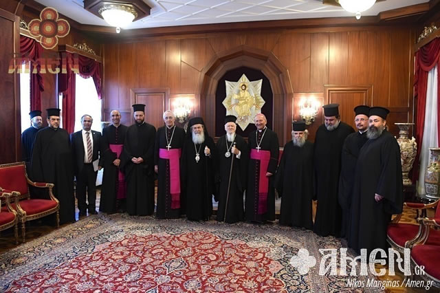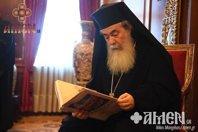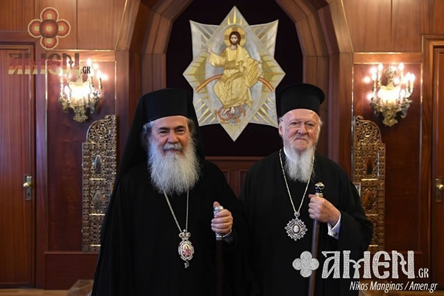 18 de junho, 2017 — O Patriarca Ecumênico Bartolomeu I recebeu na manhã desta sexta-feira, 16 de junho, a visita do Patriarca Teófilo de Jerusalém, que estava acompanhado pelo Arcebispo Aristarco de Konstantina e do Arquidiácono Marcos. S. B. Teófilo foi convidado pelo Patriarca Ecumênico Bartolomeu I a participar da peregrinação anual à Capadócia. O Patriarca de Jerusalém foi recebido no aeroporto pelo Metropolita Théolèpte de Iconium e pelo Arcebispo Nectário de Anthidonos, representante do Santo Sepulcro, em Constantinopla. Na entrada do Fanar, o Patriarca foi recebido pelo Metropolita Stefanio de Kallioupolis e Madyta e por clérigos membros do Tribunal Patriarcal. Na entrada da Igreja Patriarcal de São Jorge, leigos que servem a casa patriarcal do Fanar saudavam o ilustre visitante e recebiam sua bênção. Já no interior da Igreja Patriarcal seguiu-se a veneração aos santos ícones e, em seguida, o Patriarca Teófilo se dirigiu a sala do trono onde foi recebido pelo Patriarca Bartolomeu. O arcebispo católico de Lecce e Bari e a RP Andrea Palmieri, subsecretária do Conselho Pontifício para a Unidade dos Cristãos, também participaram da recepção, bem como, farão parte da comitiva que acompanhará o Patriarca Ecumênico Bartolomeu I na visita-peregrinação que realiza anualmente à Capadócia.
