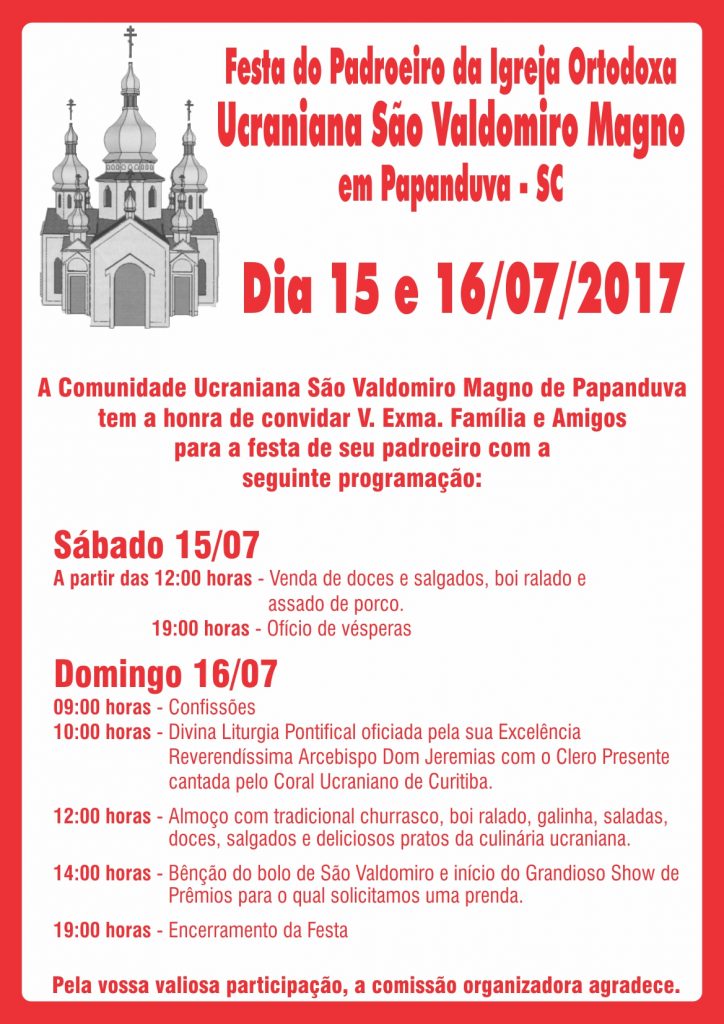A Comunidade da Igreja Ortodoxa Ucraniana São Valdomiro Magno de Papanduva – SC, tem a honra de convidar seus féis e amigos para a tradicional festa do seu patrono que será celebrada nos próximos dias 15 e 16 de Julho de 2017, com a seguinte programação: