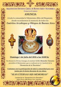 A Arquidiocese Ortodoxa Grega de Buenos Aires e Exarcado da América do Sul – Patriarcado Ecumênico, anuncia a realização de Ofício Memorial (Mnimosyno) neste domingo, 1º de julho de 2018, às 10:00, em comemoração a todos os Arcebispos e Bispos eméritos de Buenos Aires, adormecidos em Cristo. O Serviço Memorial, que será presidido por S. E. R. Dom Tarasios, terá lugar na Catedral da Dormição da Theotokos, em Buenos Aires, após a Divina Liturgia dominical.