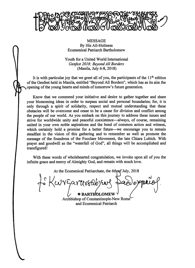 «É com particular alegria que saudamos todos vós, que participais da XI edição do GENFEST que se realiza em Manila, cujo tema “Beyond All Borders” (Além de todas as fronteiras), tem como objetivo a abertura dos corações e mentes dos jovens para o futuro. Asseguro-vos de que apoiamos a vossa iniciativa e o desejo de vos reunir e compartilhar as vossas ideias com o objetivo de superar as fronteiras sociais e pessoais; porque é somente através de um espírito de solidariedade, respeito e compreensão recíproca que estes obstáculos serão superados e deixarão de ser causa de divisões e conflitos entre as pessoas do nosso mundo. Enquanto empreendeis esta viagem para abordar estes problemas e lutar pela unidade mundial e a coexistência pacífica – sempre, naturalmente, permanecendo unidos nas vossas nobres aspirações e no vínculo de ação e testemunho comuns, que são certamente promessas de um futuro melhor –, nós vos encorajamos a permanecer firmes na visão deste encontro e a recordar, além de promover, a mensagem da fundadora do Movimento dos Focolares, a falecida Chiara Lubich. Que, com minhas orações e desejos, que querem ser como uma “cascata de Deus”, todas as coisas sejam realizadas e transfiguradas! Com estas palavras de sincera e profunda congratulação, invocamos sobre todos vós a infinita graça e a misericórdia de Deus Onipotente, e permanecemos convosco no afeto».