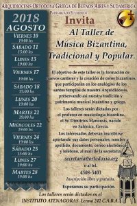 Durante o próximo mês de agosto 2018, em Buenos Aires, serão realizadas Oficinas de Música Bizantina, tradicional e Popular. O objetivo do evento é fomentar a formação de novos cantores e a criação de coros bizantinos que participarão nos analógios dos Sacros templos de nossa Arquidiocese, preservando assim nossa tradição e patrimônio musical bizantino e grego. Será uma rara oportunidade aos que desejam aprofundar o seu conhecimento musical, com aspiração de se juntar aos coros dos templos de nossa Sacra Arquidiocese em toda a América do Sul. Solicita-se participação ativa dos interessados, uma vez tratar-se de evento único e extraordinário que compreende teoria e prática da música bizantina, com desenvolvimento de dinâmicas necessárias à formação de novos cantores. As oficinas serão conduzidas pelo professor em musicologia bizantina Sr. Dimitrios Manousis, de Salônica, Grécia, que virá especialmente para nos transmitir a sua vasta experiência neste tema.