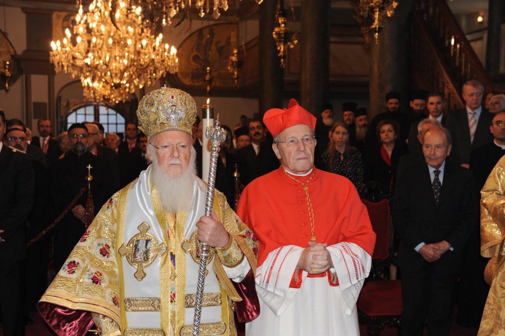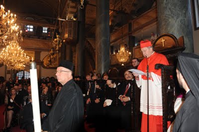 PHANAR, Constantinopla-Istambul, 01 de dezembro de 2009 [Ortodoxia.org] — Esplendor magnificência marcaram, no dia de ontem, a Festa litúrgica do Apóstolo Santo André, o santo fundador e patrono do Patriarcado Ecumênico de Constantinopla. Fiéis vindos de todo o mundo, chegaram ao Phanar – Constantinopla, na última segunda-feira para celebrar esta importante data para todos os cristãos ortodoxos. Representantes de governos dos principais países ortodoxos, bem como suas autoridades diplomáticas presentes na Turquia, hierarcas de diversas diocese de todo o mundo, célebres personalidades do mundo empresarial, delegados de entidades e comunidades da diáspora e uma delegação do Vaticano liderada pelo presidente do Pontifício Conselho para a Unidade dos Cristãos, o Cardeal Walter Kasper. Desta delegação participavam ainda os Arcebispos Dom Brian Farrell, secretário do mesmo Conselho, Dom Antônio Lucibello, Núncio Apostólico na Turquia, os Revmos. Sacerdotes, Pe. Andrea Palmieri e Pe. Vladimiro Cairoli. Após a chegada da delegação oficial do Vaticano ao aeroporto internacional M.K. Atatürk, a delegação foi recepcionada e conduzida por uma comissão do Patriarcado Ecumênico até o local onde ficariam hospedados. Desta comissão participaram o Metropolita Mijaíl da Áustria e o Secretário Geral do Santo Sínodo de Constantinopla, Arquimandrita Elpidoforos. Na tarde do mesmo dia, a delegação vaticana se dirigiu ao Phanar, sendo recebidos com as boas vindas fraternas de S. Santidade Bartolomeu I, Patriarca Ecumênico. Durante a celebração da Divina Liturgia Patriarcal de Santo André, ao finalizar a sua homilia, o Patriarca Ecumênico anunciou a presença da delegação do Vaticano, dando a palavra ao Cardeal Walter Kasper que fez a leitura da Mensagem de S. Santidade, Bento XVI, Papa de Roma. Finalizando a solenidade patriarcal foi realizado um almoço de confraternização em honra ao santo padroeiro. Cabe destacar que, na sexta-feira passada, antes dos preparativos para a celebração patriarcal, Bartolomeu I inaugurou a abertura do 1 º Congresso Internacional contra as doenças cardiovasculares e diabetes que teve lugar no hotel Intercontinental Ceylan “e sob o patrocínio do Patriarcado Ecumênico. [Foto: Nikolaos Magginas][nggallery id=25]