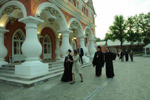 Após a chegada ao mosteiro de São Sérgio, o Patriarca Bartolomeu, acompanhado pelo Arcebispo Hilarion, chefe do Departamento de Relações Exteriores do Patriarcado de Moscou, se reuniu com autoridades eclesiásticas do Monastério de São Sergio, com o reitor da Escola Teológica de Moscou, Dom Vereysky Eugene, monges da comunidade monástica, alunos da academia teológica de Moscou e vários seminaristas. O Patriarca Bartolomeu estava acompanhado pelos membros de sua comitiva: metropolitas Michael da Áustria; Irineu de Miriofitos e de Peristasis; Emmanuel da França, secretário-geral do Santo Sínodo do Patriarcado Ecumênico; e pelos arquimandritas Elpidoforos Lambriniadis e Bessarion Komzias; e pelo Arquidiácono Maximos Vgenopulos. Após este rápido encontro, o Patriarca Bartolomeu e comitiva foram venerar as relíquias de São Sergio, dirigindo-se depois para a paramentação e procissão rumo à Igreja da Santíssima Trindade. Durante a procissão, o Patriarca abençoou os fiéis que se aglomeravam no percurso. A celebração contou com a presença de uma multidão de fiéis, autoridades do governo e religiosos. Após a celebração da Divina Liturgia, houve a celebração do Rito de Adoração (ou, do dobramento dos joelhos). Ao final , o Patriarca Ecumênico discursou agradecendo a acolhida.