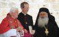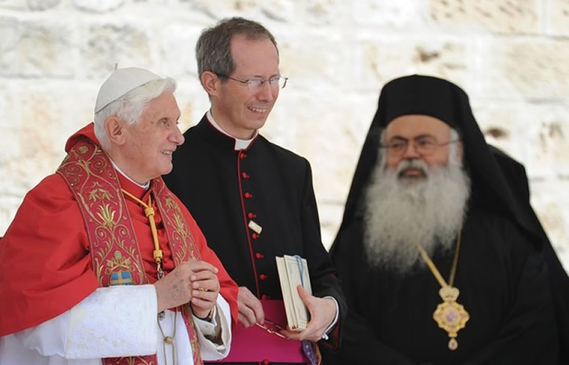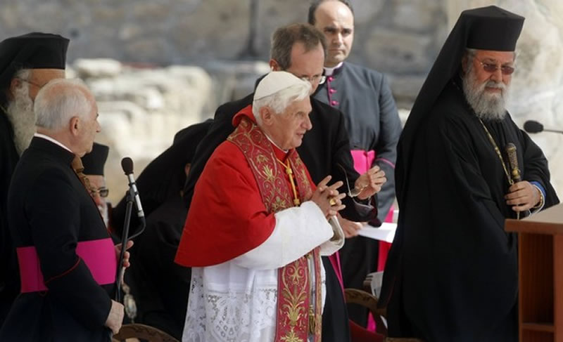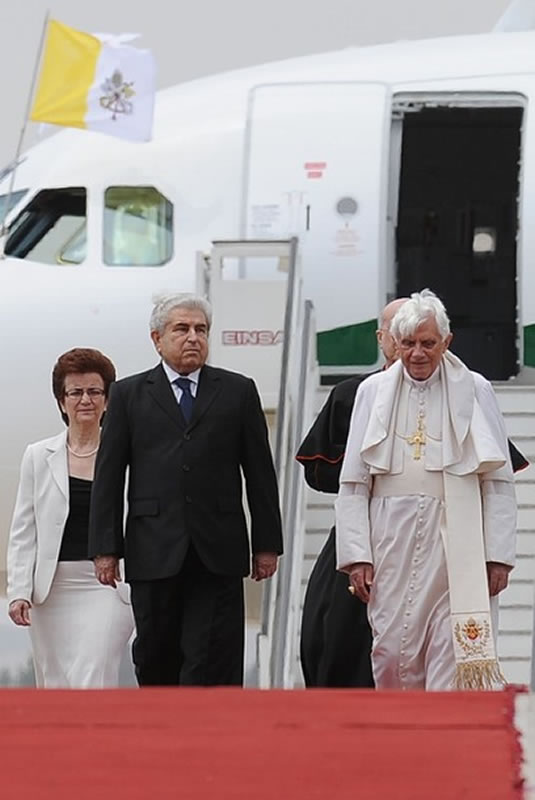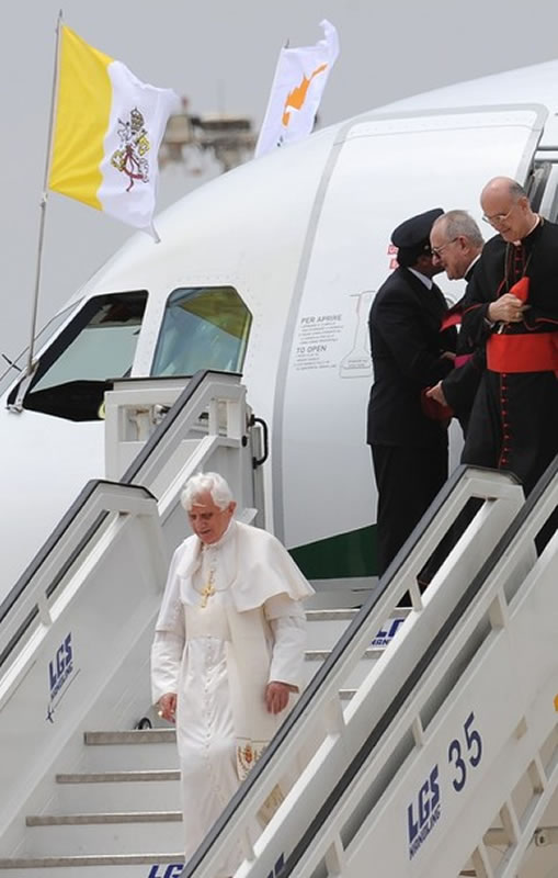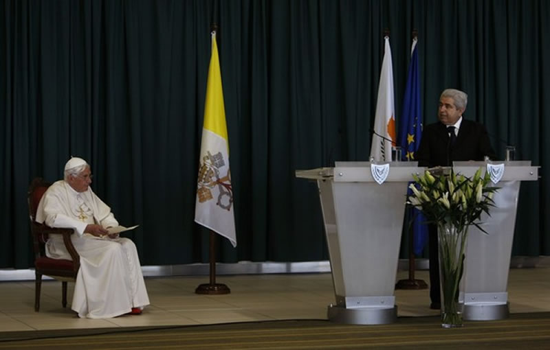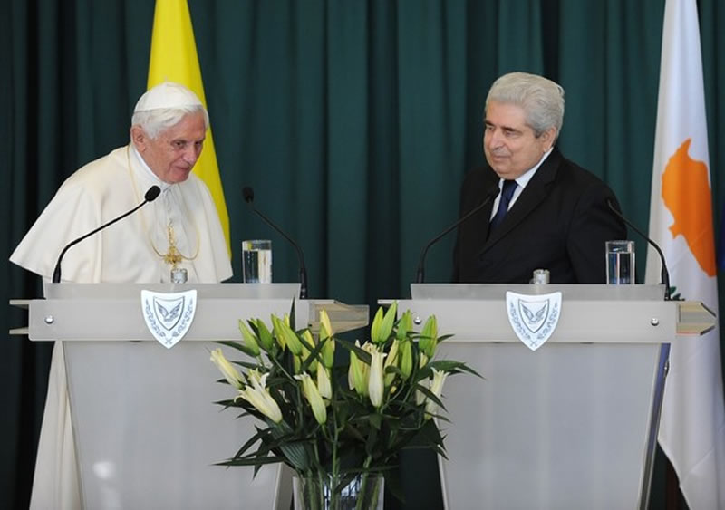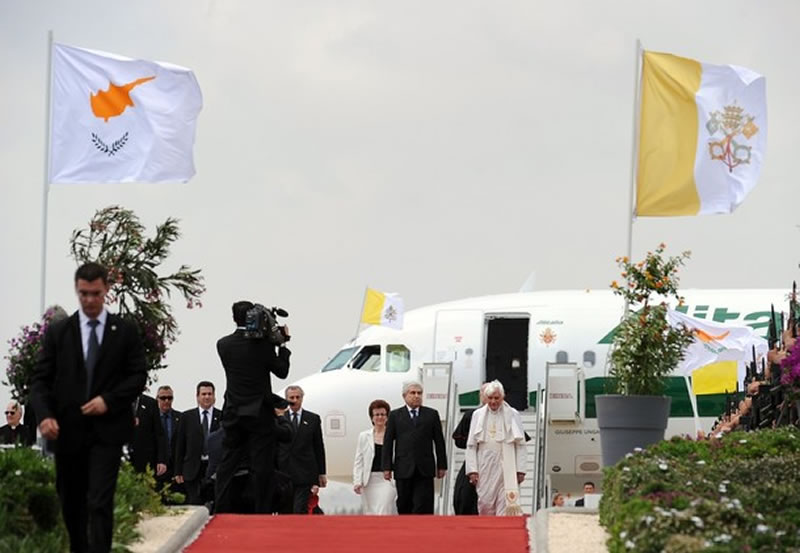 PAPHOS – Chipre, 04 de Junho de 2010 — O Papa Bento XVI chegou no início desta tarde em e a Paphos, Chipre, iníciano a uma visita de três dias àquele país. Bento XVI é o primeiro papa a visitar a Ilha onde, apenas três por cento da população é católica. À chegada ao aeroporto Internacional de Paphos o Papa foi recebido pelo presidente da República de Chipre, Sr. Demetris Christofias que estava acompanhado da primeira dama, Sra. Elsi Christofias, pelo Arcebispo Ortodoxo de Chipre Chrysostomos II, por autoridades católicas e pelo prefeito de Paphos, Sr. Savvas Vergas. Ao lado do chefe da Igreja Ortodoxa Cipriota, o Arcebispo Chrysostomos II, o Papa apelou à paz e harmonia entre vizinhos, fazendo assim referência ao conflito que divide a ilha. Após a cerimônia de boas-vindas, Bento XVI visitou o sitio arqueológico de Paphos onde, segundo a tradição, São Paulo foi torturado. Após rezar no local onde São Paulo pregou, Bento XVI celebrou um ofício ecumênico com participação de Chrysostomos II e membros do Santo Sínodo local, o mais alto órgão do governo da Igreja Ortodoxa. O Papa pernoitará no Convento Franciscano de Nicósia. No sábado, 05 de junho, às 09h10min, o Papa será recebido pelo presidente Christofias e sua esposa Elsie no Palácio Presidencial. Após a troca de presentes, terão um encontro previamente agendado. Em seguida, o Papa irá assinar o livro de visitas do Palácio Presidencial e se dará as apresentações protocolares das delegações de Chipre e da Sé Apostólica de Roma. Depois, Bento XVI visitará o Colégio de São Maron, onde descerrará uma placa comemorativa de sua visita àquele local. Nesta oportunidade, o Arcebispo Maronita Yousef Soueif fará uma saudação ao Papa e sua comitiva. Ao meio dia, Bento XVI irá à Sede da Igreja Ortodoxa de Chipre, onde será recepcionado pelo Arcebispo Chrysostomos II e por membros do Santo Sínodo Ortodoxo. Lá haverá um encontro privado entre o Papa e Arcebispo Chrysostomos . Após o almoço, que o Arcebispo Chrysostomos oferecerá ao Papa e sua comitiva, haverá troca de presentes. Em seguida, no final da tarde, o Papa celebrará Missa no Convento dos Franciscanos. No Domingo, às 9,15h, está programada a ida do Papa ao Estádio da Liberdade, onde celebrará uma Missa e entregará aos bispos do Médio Oriente o “Instrumentum Laboris”, documento de trabalho do sínodo que se realizará no Vaticano, entre 10 e 24 de Outubro, sobre a situação da Igreja Católica naquela região. Após a celebração, visitará ainda a Igreja Maronita Nossa Senhora das Graças. Às 17 horas retornará para Roma.
