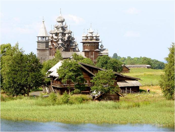 Kiiji é uma ilha no extremo norte do lago Onega na República da Carélia. Com 7 km de comprimento e 500 m de largura é cercada por outras ilhas e ilhotas (cerca de 5 000), algumas não medem mais de 2 metros de diâmetro e outras têm até 35 km de comprimento. Logo após a conquista da Finlândia, a Igreja Ortodoxa foi construída (em 1714). O adro (Pogost) é constituído por duas igrejas, uma torre octogonal, rodeado por uma cerca, todas construídas de madeira. A jóia da arquitetura original é a Igreja da Transfiguração, o trabalho de carpintaria revestindo 22 cúpulas de prata formando uma pirâmide. A Igreja da intercessão da Virgem, coroada com 9 cúpulas foi construído apenas em 1764. Estes dois edifícios inteiramente de madeira, ilustram a técnica dos carpinteiros da época, eles não usavam pregos ou parafusos ou peças de metal. Um verdadeiro museu ao ar livre da arquitetura de madeira careliana. São Lázaro, século XIV (o mais antigo da Rússia, do mosteiro Mouromski). Um moinho de vento (também o mais antigo na Rússia) e também casas de madeira nas proximidades. A singularidade deste monumental lhe valeu a ser Patrimônio Mundial pela UNESCO em 1990.