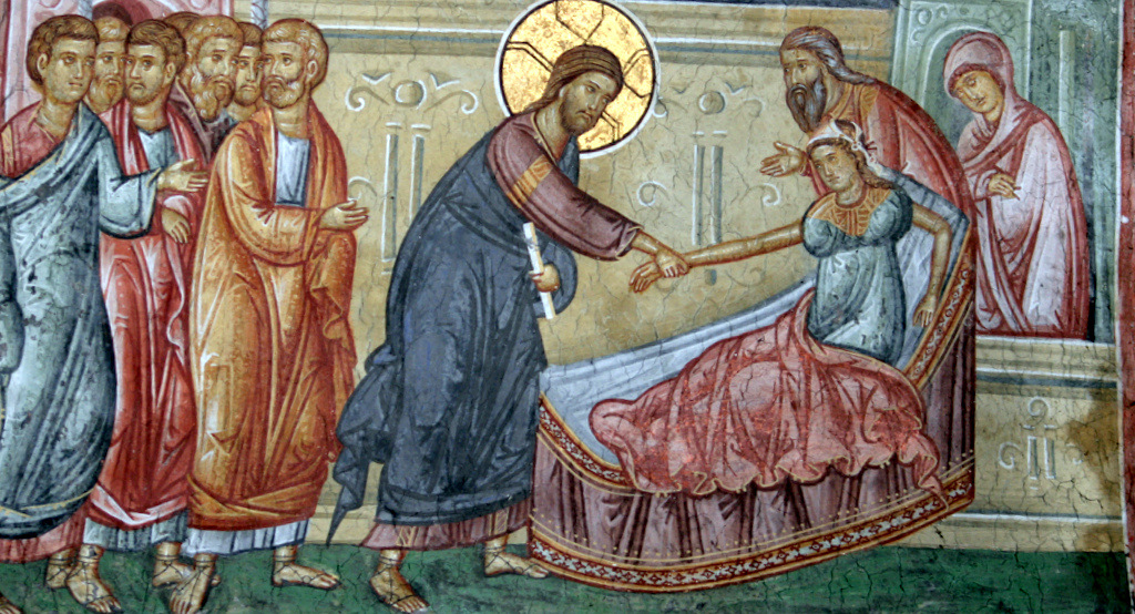 Mateus, Marcos e Lucas narram os milagres que se sucederam após a expulsão dos demônios na cidade de Gerasa. Aconteceram enquanto o Senhor retornava à Cafarnaum, seguido pela multidão. Jesus estava agora diante do poder da doença e da morte. As duas beneficiadas são mulheres. Uma sofria de uma enfermidade incurável que a arruinava e a afastava do convívio da sociedade, porque sua doença era vista como sinal de impureza e contaminação e, por isso, uma ameaça à integridade. A outra, uma menina, filha única, que não resistiu a uma doença grave. Ao chegar na cidade uma multidão o esperava, sobretudo os curiosos e cheios de fé. Também estava lá o chefe da Sinagoga, Jairo, que pedia ao Senhor o restabelecimento da saúde de uma filha que estava a ponto de morrer. Jesus chamou Pedro, Tiago e João que o acompanhassem para serem testemunhas daquilo que iria se realizar …
