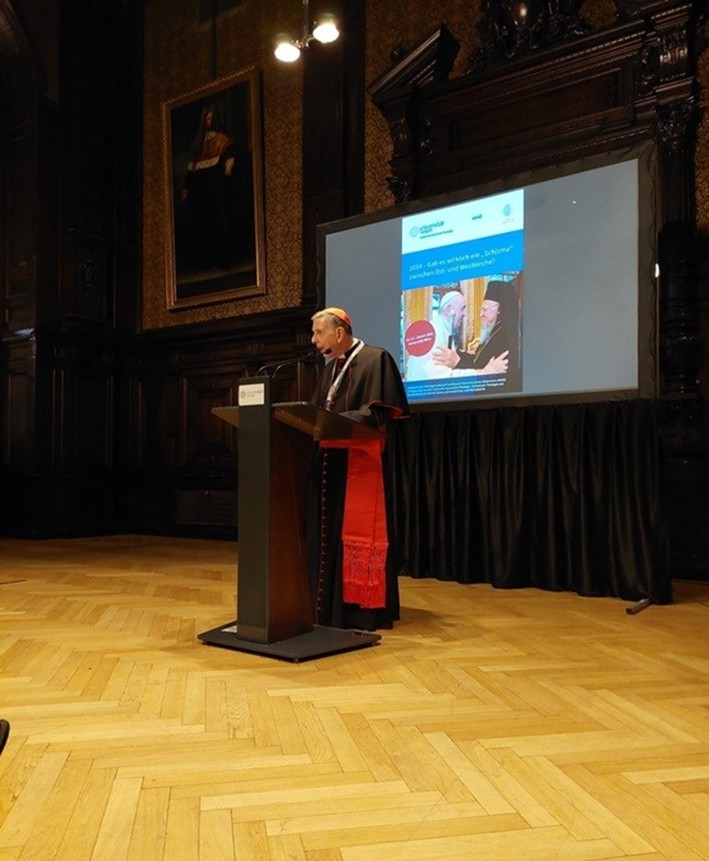 Foi um trabalho de oração que foi possível assegurar como orador principal do simpósio internacional o mais adequado, mas também aquele que é de fato competente na Igreja Católica para questões intercristãs e ecumênicas, o conhecido Cardeal Kurt Koch (Vaticano), Presidente do Pontifício Conselho para a Promoção da Unidade dos Cristãos, que também é Co-presidente da Comissão Internacional para o Diálogo Teológico Oficial entre as Igrejas Católica e Ortodoxa. Ele desenvolveu profundamente e com responsabilidade científica, já que também era professor universitário, o tema: “No caminho para a restauração da unidade na Igreja entre Oriente e Ocidente”. Analisando os eventos de 1054, ele determinou que o propósito da missão da delegação do Papa Leão, liderada pelo Cardeal Humberto, era principalmente negociações de paz e não anátema. O objetivo principal era concluir uma aliança militar entre Roma e Constantinopla para combater os normandos na Itália, o inimigo comum, já que também havia comunidades bizantinas no sul da Itália e na Sicília. Em vez de atingir esse objetivo, Humbert criou um escândalo (um eklat, como o Cardeal Koch o chama) com fracasso total. Devido a eventos desagradáveis em Constantinopla durante a estadia da delegação, um clima muito negativo foi criado lá, e apesar do Cardeal Humberto saber que o Papa havia morrido em 19 de abril, ele depositou o Anátema em 16 de julho no Santo Altar de Hagia Sophia, com o qual ele anatematizou o Patriarca Miguel Kyroularios e o Arcebispo Leo de Ohrid. O Patriarca Miguel mais tarde, no dia 24 de julho de 1054, anatematizou o Cardeal Humberto, autor do texto do Anátema, e todos aqueles que concordavam com ele. A partir do exame cuidadoso dos eventos em Constantinopla e dos textos das Anátemas, afirma o Cardeal Koch, chega-se à conclusão de que os anátemas não foram feitos contra as Igrejas, mas contra pessoas específicas, que são de fato mencionadas especificamente nos textos dos anátemas. O Cardeal Koch lembra que a Declaração Conjunta do Papa Paulo VI e do Patriarca Atenágoras sobre a revogação dos anátemas em dezembro de 1965 enfatiza que esses anátemas diziam respeito a pessoas específicas e não às Igrejas e que não pretendiam interromper a comunhão eclesiástica entre os Tronos de Roma e Constantinopla. E o Cardeal Koch conclui que