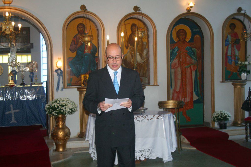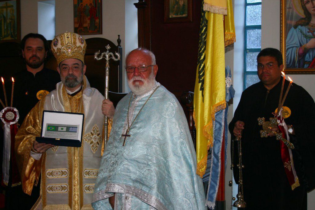 No domingo, 30 de Outubro, após o ofício das Matinas que teve início às 9 horas da manhã, S. Eminência presidiu a solene celebração da Divina Liturgia. Ao final, Pe. Emanuel Sofoulis, em nome de toda a Comunidade, fez a entrega ao Arcebispo de uma placa comemorativa aos 10 anos de labor pastoral de S. Emncia. à frente da Metrópole de Buenos Aires e America do Sul. Em seguida, foram depositadas flores no marco da Pátria-mãe pelo Embaixador da Grécia, Sr. Dimitri Alexandrakis, pela Embaixadora do Chipre, Sra. Martha Mavromatis e pelo Presidente da Comunidade de Brasília, Sr. Elias Grintzos, nas comemorações de uma das mais importante datas do calendário oficial da Grécia, o “Dia do OXI”, bem como pela passagem do 50º. aniversário da Independência da República do Chipre, enquanto os hinos oficiais das duas nações eram cantados pelos alunos da escola da língua grega a cargo dos Professores Nikolas e Anastasia.